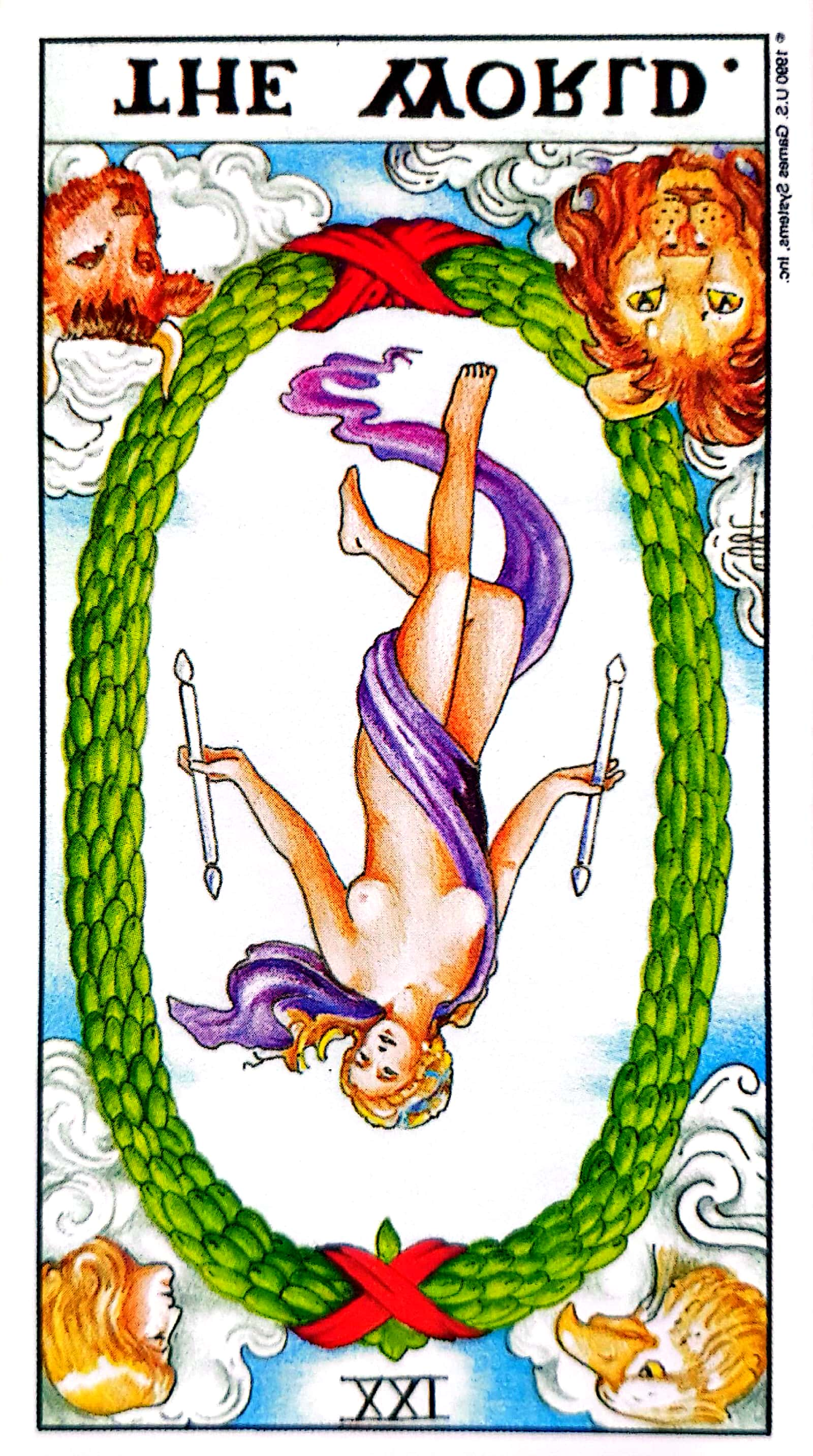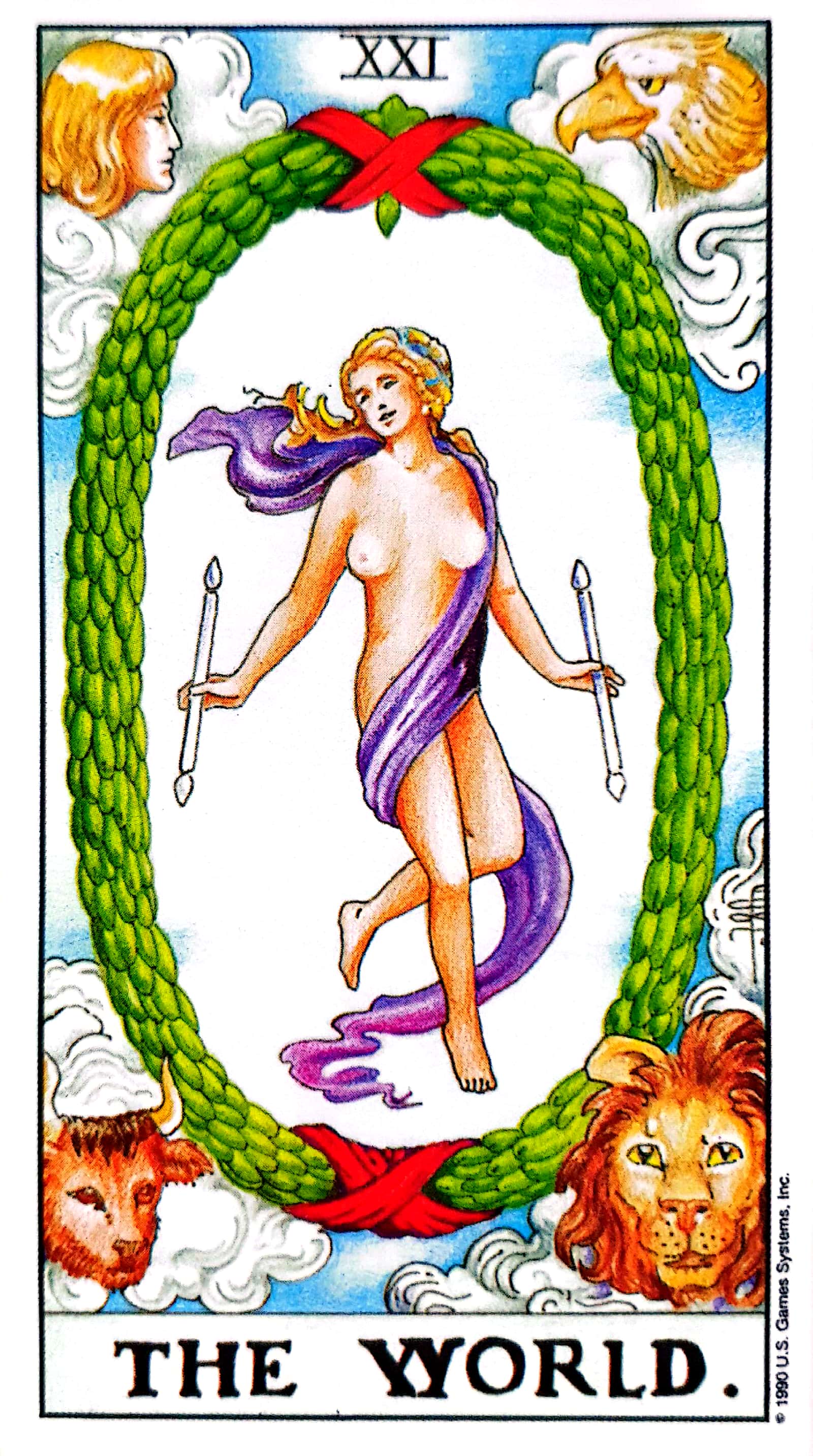또 카드의 네 구석에는 이 세상을 형성하는 4대 원소, 불·땅·바람·물을 상징하는 독수리, 사자, 황소, 인간이 그려져이습니다.