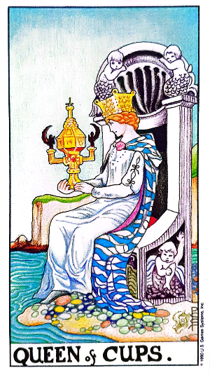 섬세한 여성을 나타내는 컵의 퀸은 자신이 가지는 물의 성질과의 시너지 효과로, 엄청난 사랑을 부어 줍니다.