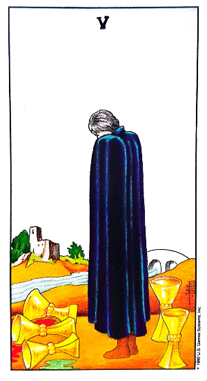 한 사람이 검은망토를 뒤집어 쓰고 뒤에 세워진 2개의 컵을 보지 못한 채 앞에 쓰러진 3개의 컵을 보고 시무룩하게 서 있습니다.