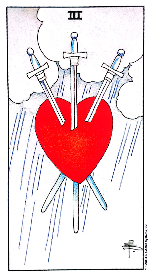 소드 3에서 숫자 3은 남성과 여성으로부터 새로운 생명이 탄생하거나 점과 점을 연결하여 "형태"가 태어납니다. 심장에 3개의 칼이 꽂혀있는 모습은 그 결과물이 기대에 너무 못 미치는 상황이나 우려했던 일이 벌어지거나 이성적으로 판단했을때 받아들여지는 상황 등을 의미합니다.