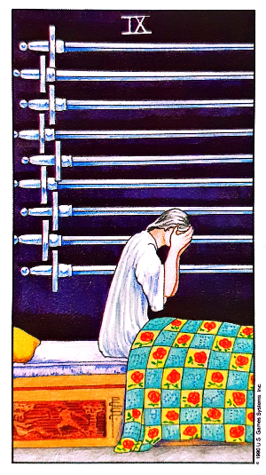 소드 9 9는 도달과 완성을 의미함과 동시에 '1'에서 '8'까지 모든 것을 가지고 있기 때문에 흔들리기 쉽고 불안정한 요소도 가지고 있습니다. 「9」라고 하는 숫자가 가지는 부정적인 면이 매우 강하게 그려져 있는 카드입니다.